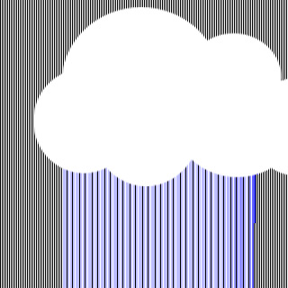 Similar to Gold, Elna Frederick’s @ = landscape, takes a humorous look at online representations of nature: sky, clouds, and rain. The rain is hyper-geometric, consisting of thick blue lines, all of equal width, and all falling from right to left consistently. The visual effects of the blue lines appear one after the other, resembling the mechanized movements of an ink-jet printer filling in the lines of a page––far from the painterly style of fluid brush stokes and nuanced colorism that has long esteemed classical landscape painting.